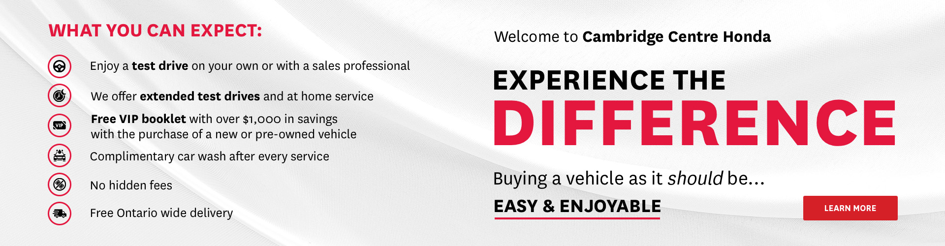 Our philosophy is simple: We believe that buying and owning a car should be easy, enjoyable and transparent. At Cambridge Centre Honda, we tell the truth, we keep our promises, and we hold our customers and our team in high esteem. When you walk into our dealership, whether to purchase a vehicle or to visit our service department, you will feel like part of our family and each team member will do everything they can to make your experience as simple and enjoyable as possible.